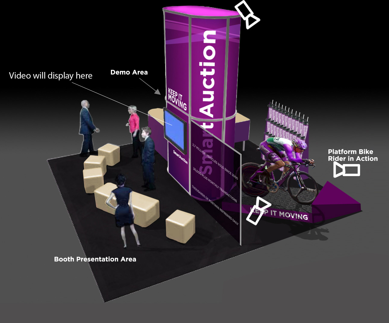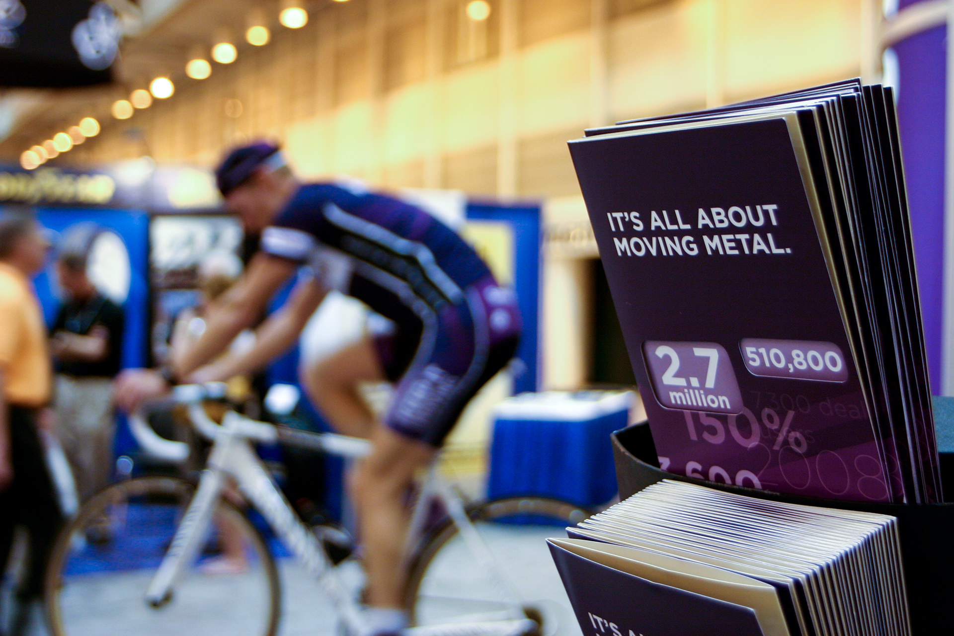 We started the rebrand with a new trade show booth. The booth concept utilized two professional cyclist that represented the meaning of momentum and motion. At each trade show the cyclist on training rollers never stopped cycling. Video of the cyclist were captured by several cameras positioned around the booth and broadcast on to large screen TV as well as a webcast.